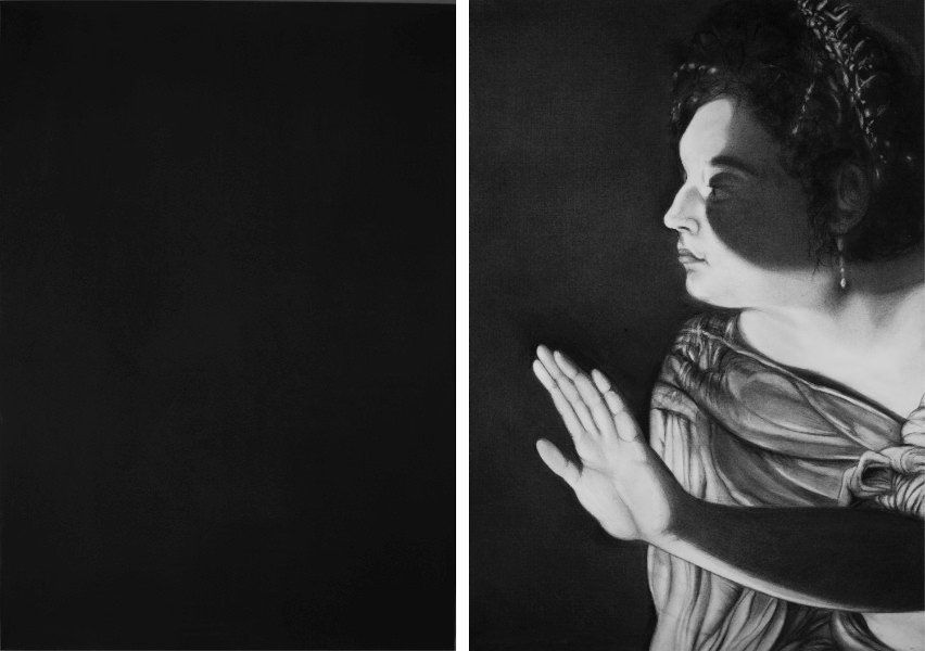 [ ], 2025 – Museum der Schatten, [Artemisia Gentileschi], Kohle/Papier, 2-teilig, je 100 × 70 cm, gesamt 100 × 142 cm