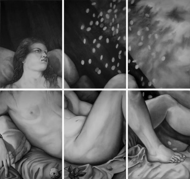 DANAE, 2025 – Museum der Schatten, [Tizian], Kohle/Papier, 6-teilig, je 100 × 70 cm, gesamt 202 × 214 cm