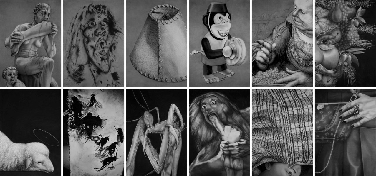 VERLEIBEN, 2025 – Museum der Schatten, [Leonhard Kern, Antonin Artaud, Lampenschirm aus Menschenhaut - Buchenwald, Gustave Doré, Giuseppe Arcimboldo, Francisco de Zurbarán, Jaques-André Boiffard, Francisco José de Goya], Kohle/Papier, 12-teilig, je 100 × 70 cm, gesamt 202 × 430 cm